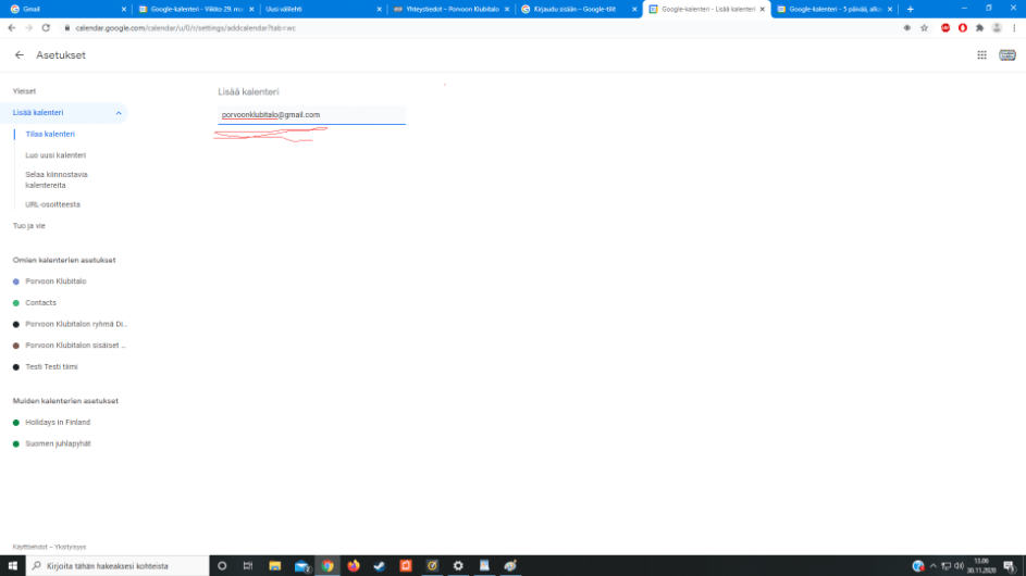 4. Kirjoita Lisää kalenterin alapuolelle porvoonklubitalo@gmail.com